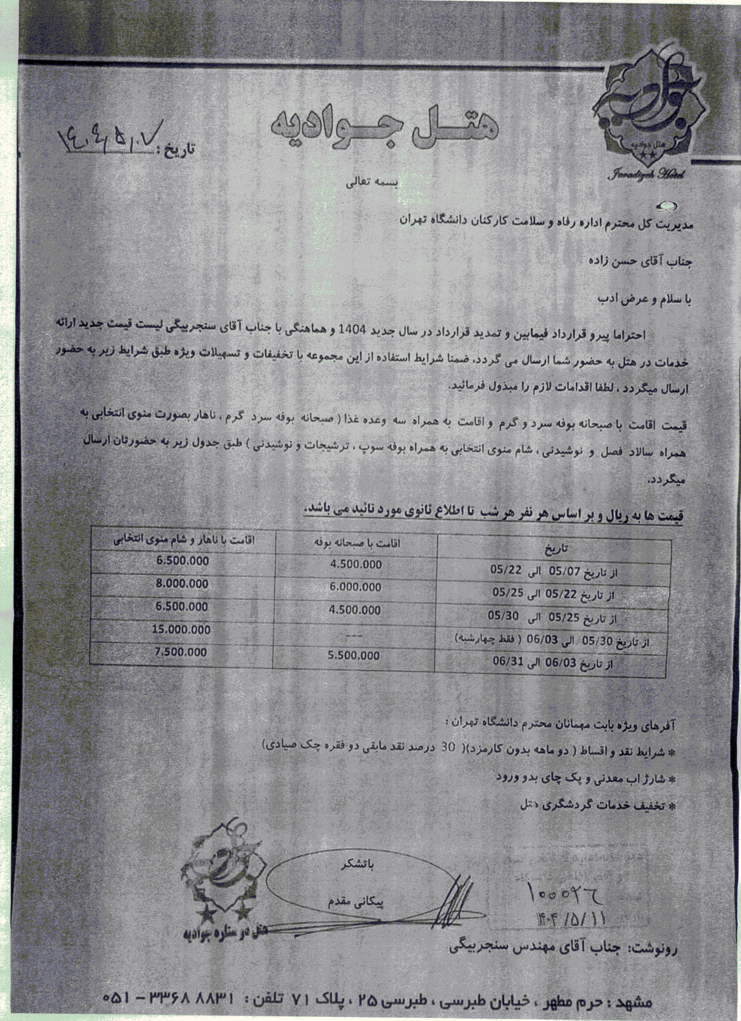 به اطلاع میرساند پیرو توافق صورت گرفته اداره کل رفاه و سلامت کارکنان دانشگاه تهران، کلیه همکاران و بازنشستگان ارجمند دانشگاه میتوانند در سال ۱۴۰۴ با ارائه معرفی نامه و کارت پرسنلی معتبر، از خدمات (اقامتی) هتل دوستاره جوادیه (مشهد مقدس) به صورت فولبرد با تعرفه ویژه دانشگاه تهران، استفاده نمایند.