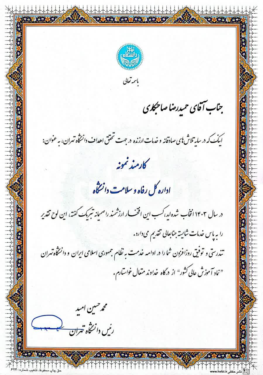 به گزارش روابط عمومی اداره کل رفاه و سلامت کارکنان، در آیین تجلیل از خدمات ارزشمند کارکنان دانشگاه تهران که در روز چهارشنبه، 5 شهریورماه 1404، در تالار فردوسی دانشکده ادبیات و علوم انسانی برگزار شد، از جناب آقای حمیدرضا صاحبکاری، همکار شاغل در اداره کل رفاه و سلامت کارکنان (مرکز همایشهای علمی و فرهنگی مشهد مقدس) به عنوان کارمند نمونه این اداره کل تقدیر به عمل آمد.